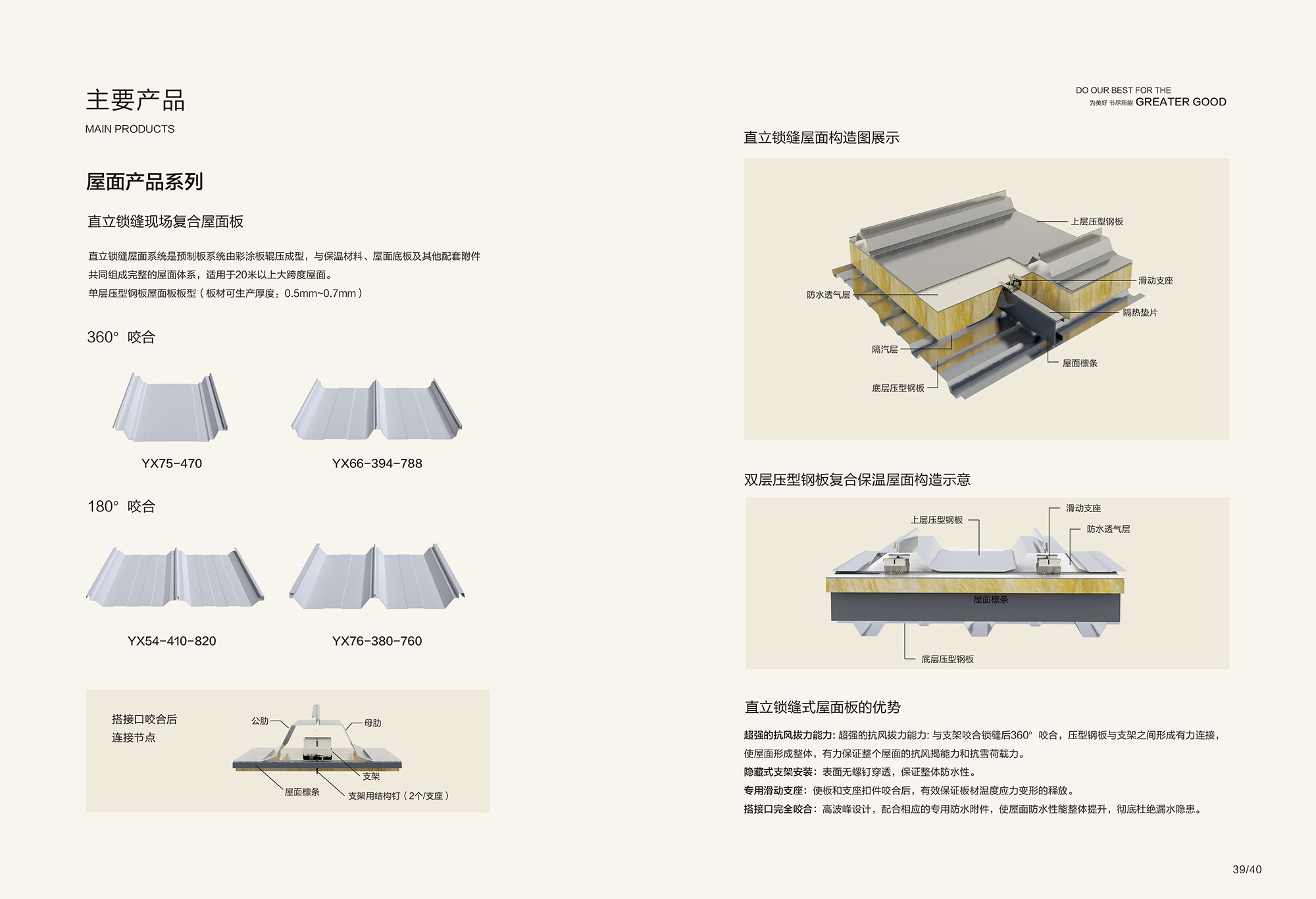 德赢VWIN节能金属屋面系统高波峰设计、排水效率高,板型构造防水性强,直立锁缝式搭接,强度高、负荷能力好,可直接安装光伏预制化屋面,提升施工效率。